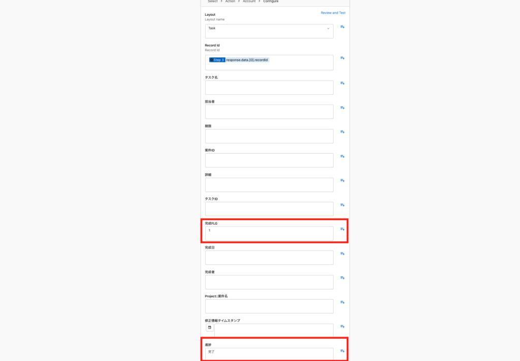 フロー実行後(完成FLGと進捗フィールドは更新されました。それぞれ1と完了になりました。)