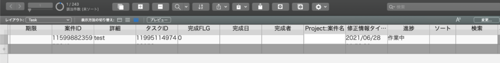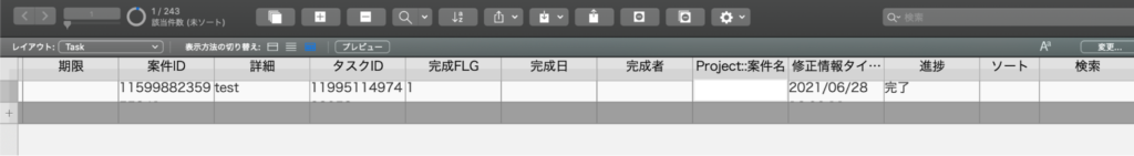 - フロー実行前(「完成FLG」が0で進捗は「作業中」です。)