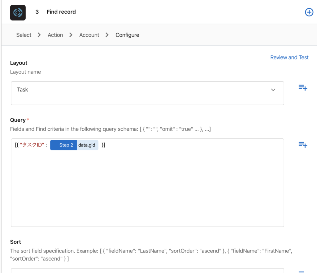 クエリーは下記のようにJSON形式で書かれています。検索値はステップ2のIDになります。(ログイン方法とステップのデータの使用は「第1回〜 Claris Connect とBoxの連携〜」を参照してください。)