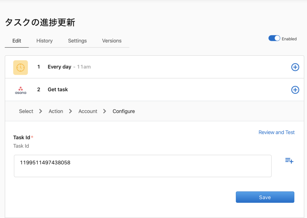 - Asana側にそのタスクが「完了」になったら完成FLGと進捗を編集します。