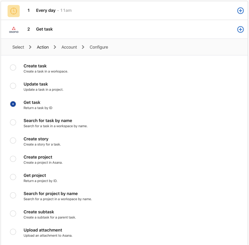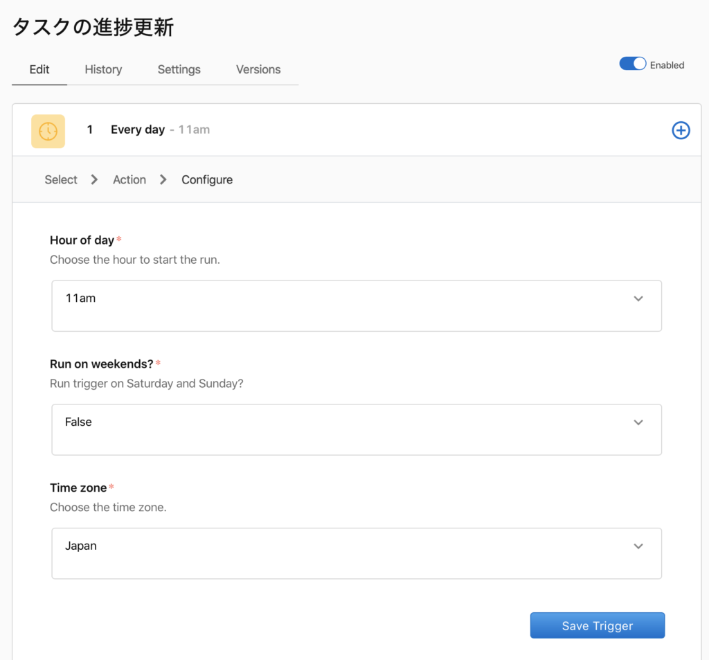 - ステップ1は「Schedules」というトリガーです。毎日11時に更新をかけます。