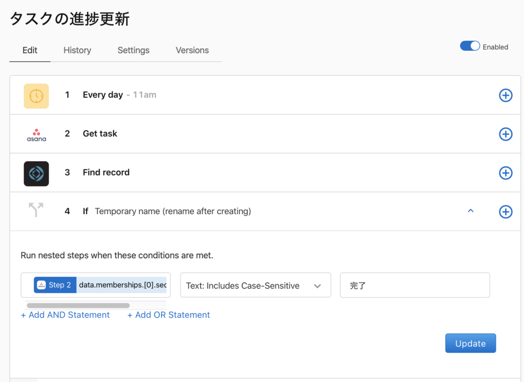 - 今回は「If」を使用します。もしステップ2のタスクが「完了」になったら次のアクションを指定します。ここに「Text:Includes Case Sensitive」を使用していますが、日本語には大文字、小文字の区別はありませんので、英語や他の言語を使う方は要注意です。