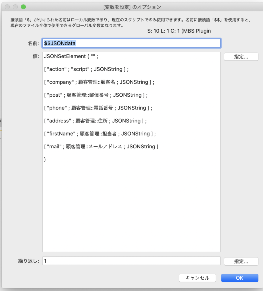 - 変数設定のステップを追加します。変数名は$$JSONdataで、値は{“action”:”script”}になります。