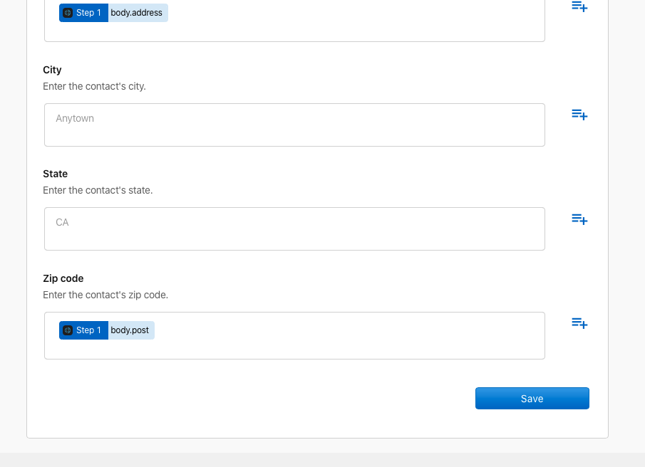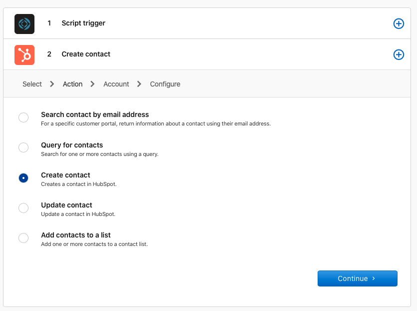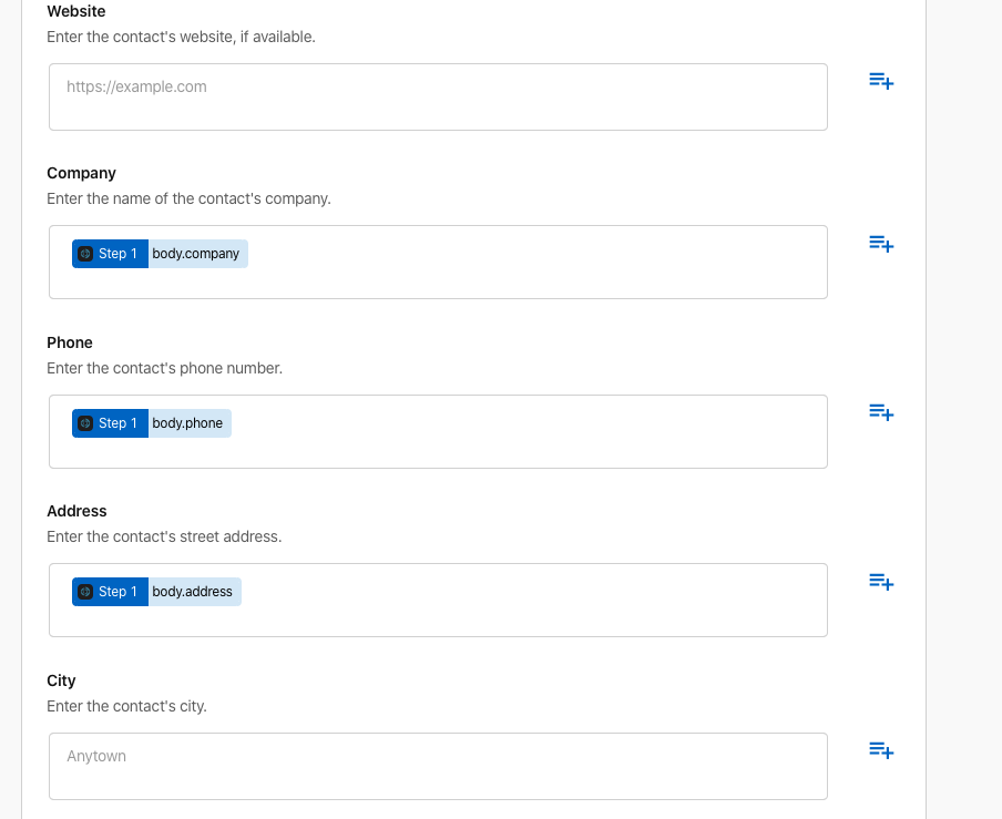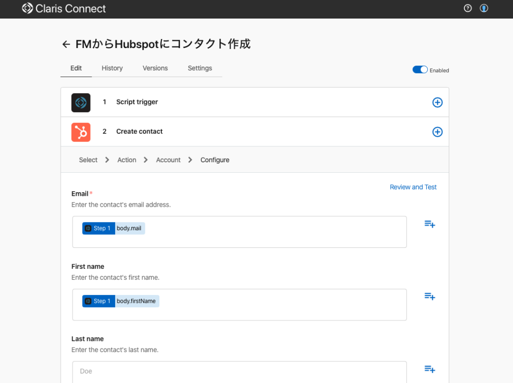 - Hubspot にログインしたら、設定画面になります。FileMaker から渡したデータを設定します。(ログイン方法とステップのデータの使用は第1回〜 Claris Connect と Box の連携〜を参照してください。)