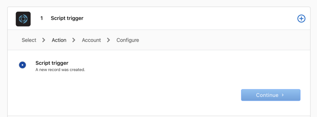 アクションはスクリプトトリガー1種類です(新規レコードを作成した場合)。