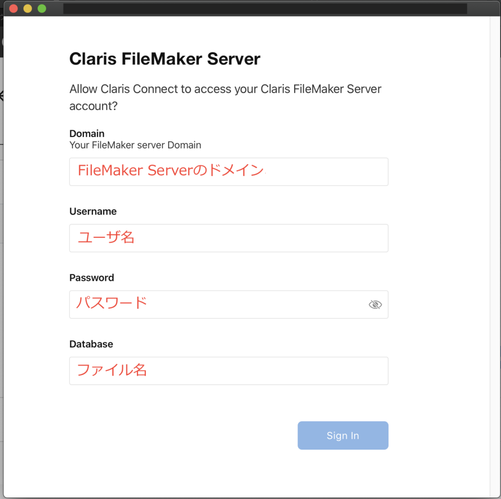 - Connect New Claris FileMaker Server Accountを押したら、ログイン画面に入ります。FileMaker Server のドメイン、ユーザ名、パスワード、ファイル名を入力します。