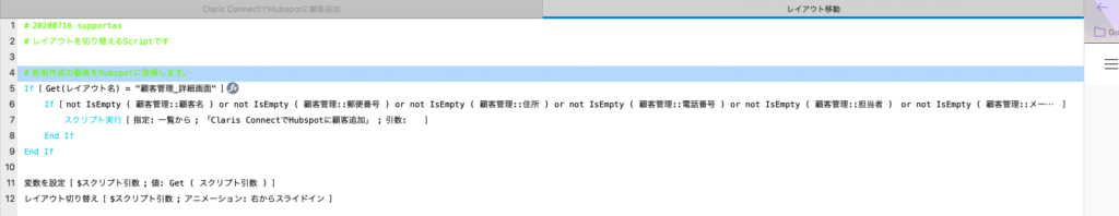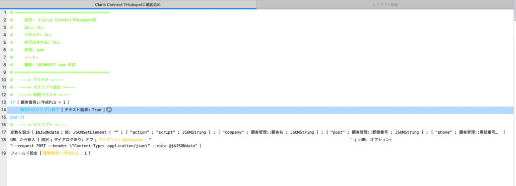 文字列をエスケープすることを避けたいため、JSONSetElementの関数を使います。Hubspot 側の登録は一回のみなので、FLGを使います。Hubspot に登録したら1を設定し、2回登録できないようにします。(注意:6-3の変数を修正したため、もう一度スクリプトを実行します。Claris Connect 側に反映されるようにします。)