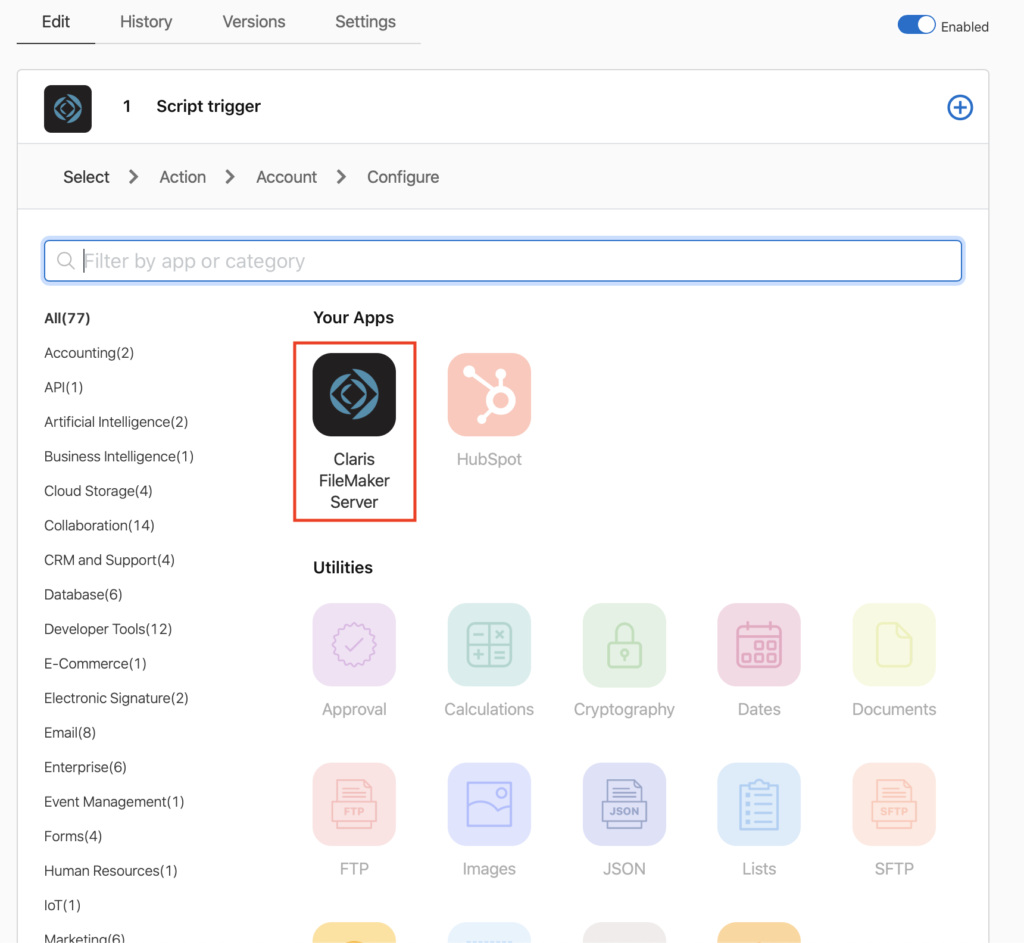FileMaker Server にホストしているファイルから何らかの動作をし、Claris Connect のフローを実行するトリガーです。