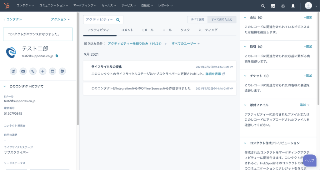 - Hubspot 側で確認すると14で追加した会社の情報は Hubspot に登録されました。