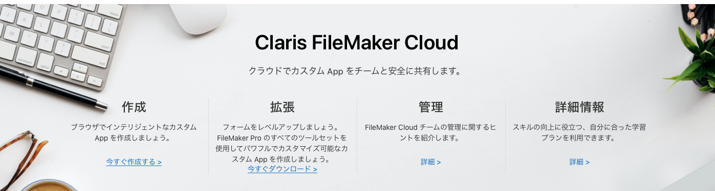 - 「作成」はカスタムアプリを FileMaker Cloud 上に作成することができます。