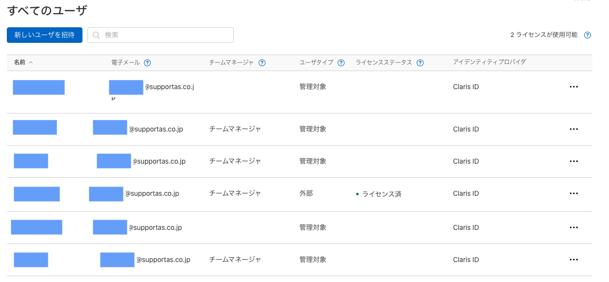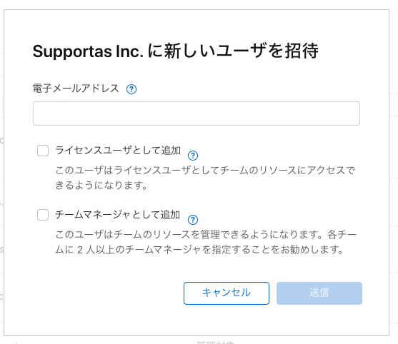 「新しいユーザを招待」を押したら、メールアドレスで新規ユーザの追加ができます。ライセンスユーザもチームマネージャも合わせて設定できます。