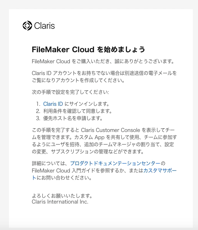 - FileMaker Cloud をサブスクリプションを購入すると、下記のメールが届きます。メールのリンク先 ( Clairs ID ) を押すと作成画面に移動します。すでに購入済の FileMaker Cloud からの招待をうける場合も同様の手順となります。