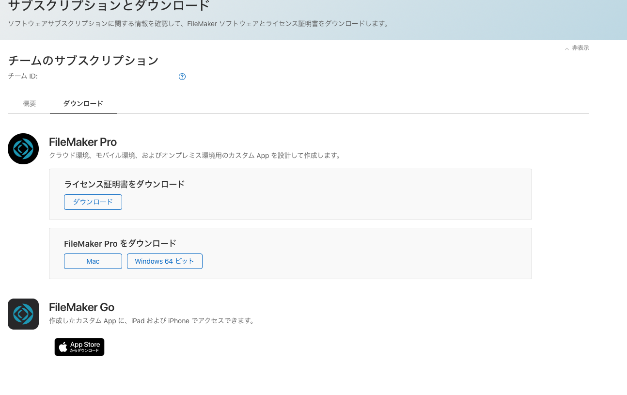 ダウンロードに FileMaker Pro 19 (デスクトップ用)、ライセンス証明書のダウンロードができます。FileMaker Go 19 の App Store のダウンロード先も確認できます。