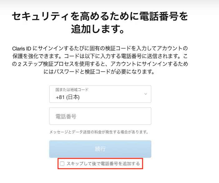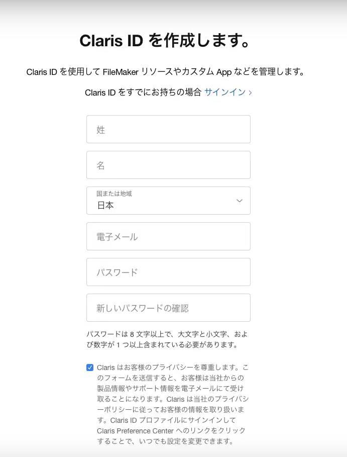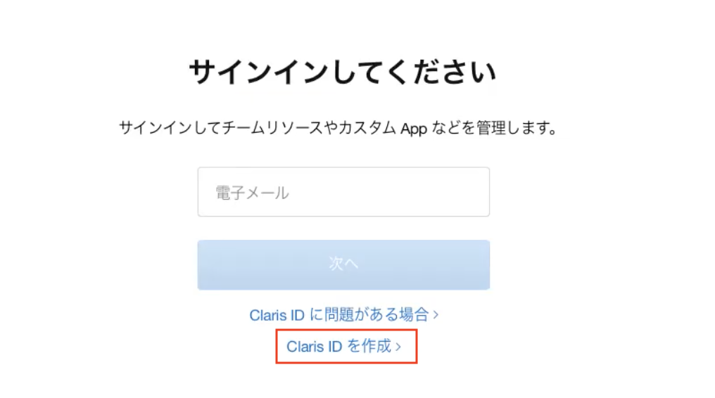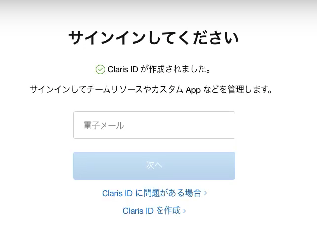 - 「Claris ID を作成」を押します。すでに作成済の場合は、この手順は不要です。