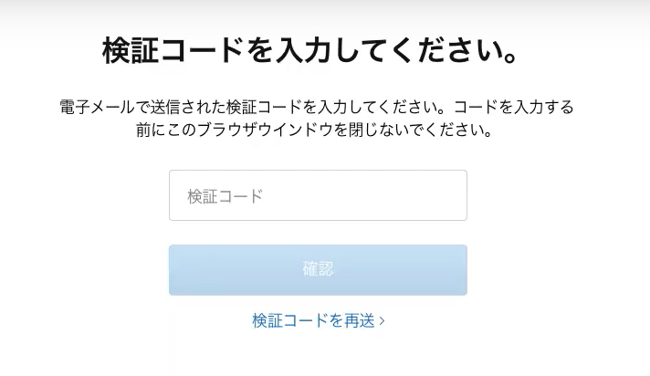 - メールに届いた検証コードを入力します。検証コードが届かなかった場合は「検証コードを再送」を押してください。
