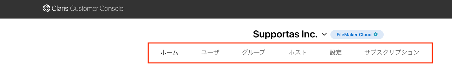 Claris Customer Console にログインすると、「ホーム」画面が表示され、それ以外のメニューは「ユーザ」、「グループ」、「ホスト」、「設定」と「サブスクリプション」があります。