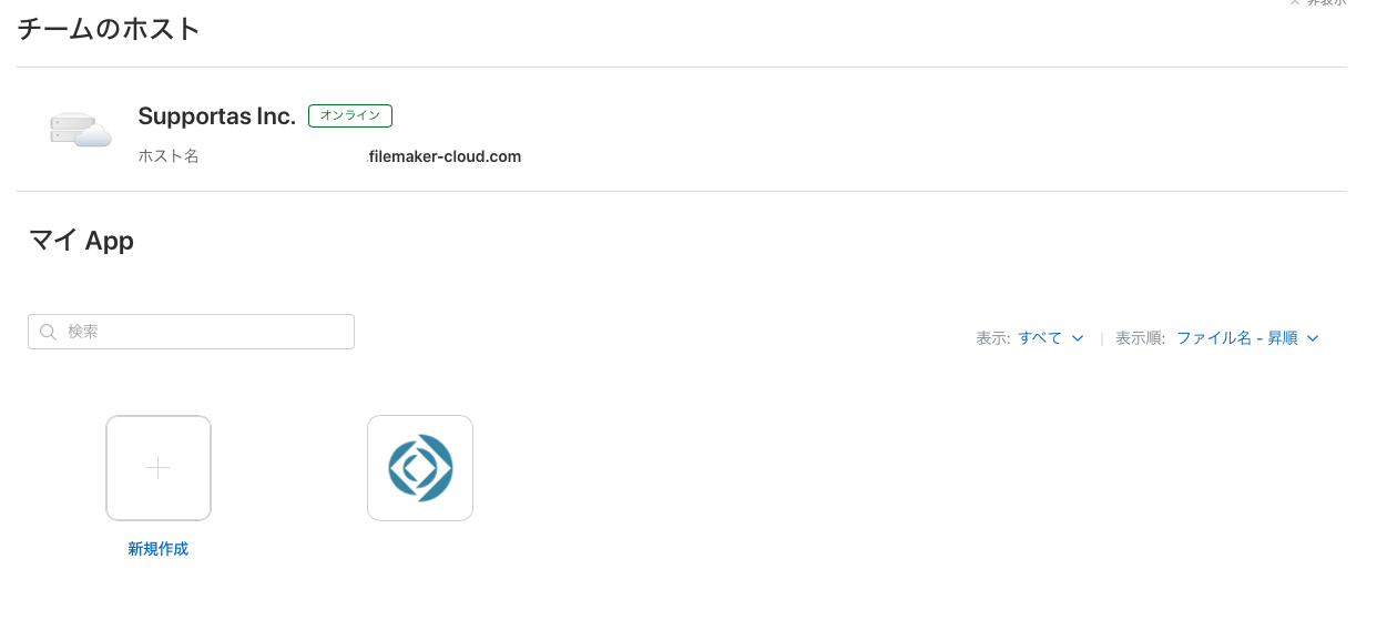 下部にホスト名、今ホストされているファイルを確認できます。それ以外は上記1の新規ファイルの作成機能です。ホストされているファイルを押すと、FileMaker Pro (デスクトップ)で開くことができます。