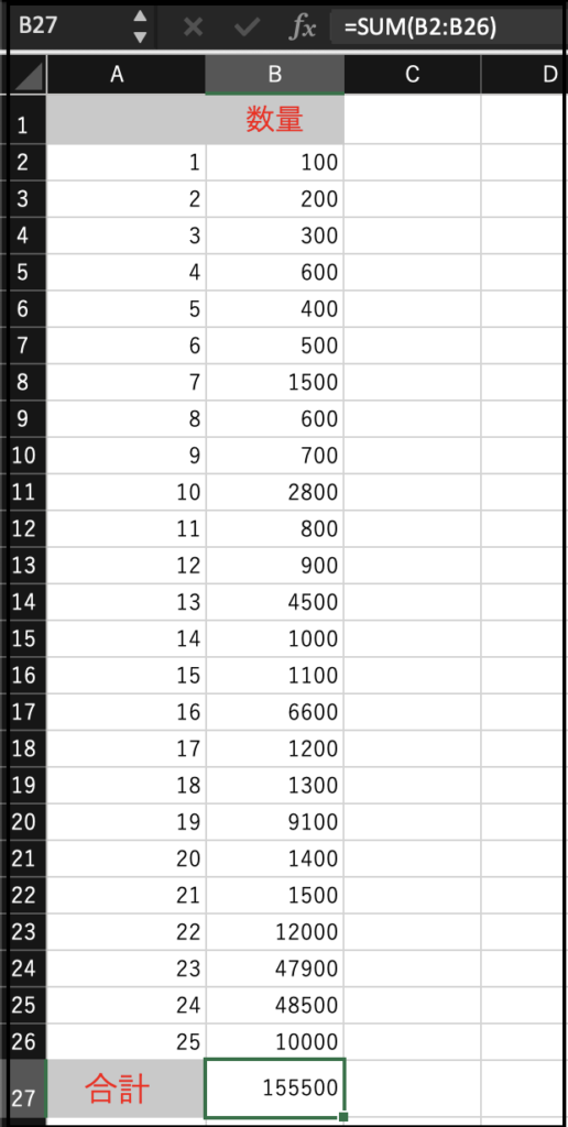 ・Excel の場合は、「B2からB26」まで連続した値の合計「SUM」関数を使うのが一般的かと思います。例: