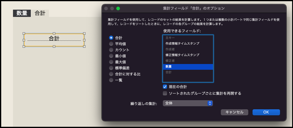 ・FileMaker の場合は、このように集計フィールドを使って簡単に合計を出すことができます。例: