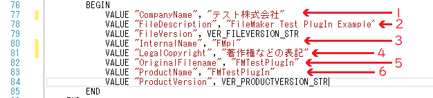 必要に応じて、1.会社名、2.プラグインの説明、4.著作権の表記、5.プラグインファイル名、6.プラグイン名