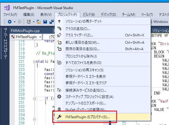 メニューの「プロジェクト」→「FMTestPlugInのプロパティ」を選択します。