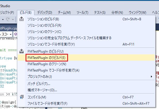 ビルドを行います。メニューより「ビルド」→「FMTestPlugInのリビルド」を選択します。