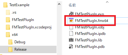 ビルドが終了すると「Release」フォルダーの中に「FMTestPlugIn.fmx64」が作成されています。