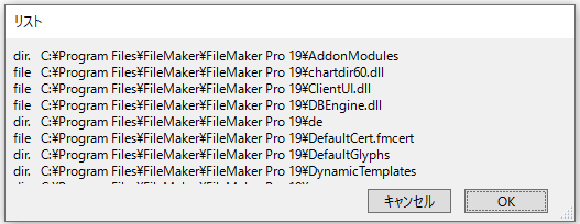 スクリプトを実行すると、「FileMaker」フォルダーの一覧が取得できている事がわかるかと思います。