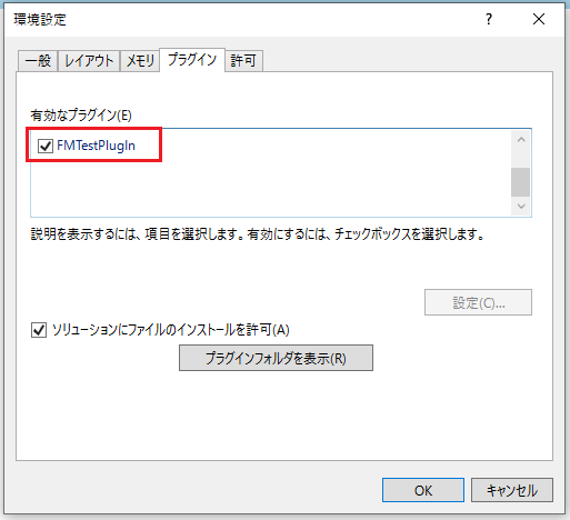 「プラグイン」タグを選択し「FMTestPlugIn」にチェックを付けます。