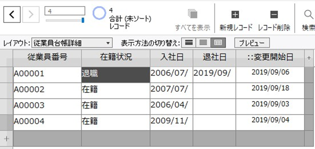 実行後の画面で、レコードの件数が4件になっています。