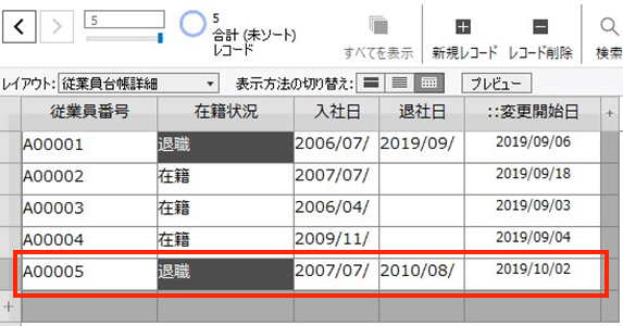 マウスカーソルが5行目の「A00005」を選択した状態で実行をしています。