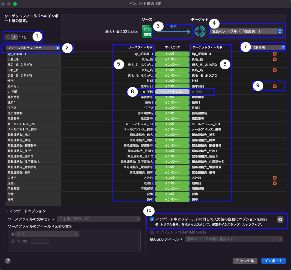 ⑤ソースフィールドとは、取り込むファイルのデータの項目名のことを指します。ここでは、取り込む Excel ファイルの項目名が表示されています。