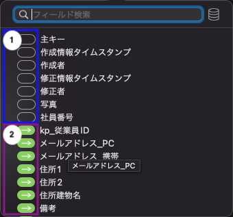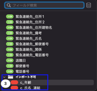 マッピングしている時に、以下(図)のように違いが出てくると思います。これは、単純に①は選択されてないフィールド、②は選択されているフィールド、③は計算式タイプのフィールドであるため「インポート不可」ということになっています。