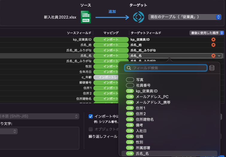 ③今回は、取り込む Excel 形式ファイルから取り込み先 FileMaker へ「追加」インポート方法で追加します。他の方法は、「結ぶ矢印(→)」をクリックするとポップオーバーが表示され「更新」や「置換」方法を選択できるようになります。
