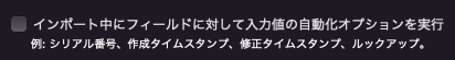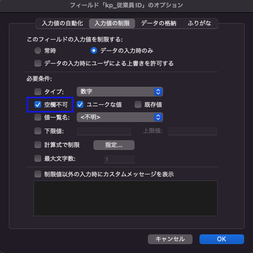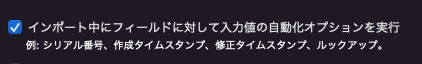 インポートオプションでこのフィールドに対して「入力値の自動化オプションを実行」にチェックを入れずにインポートしてしまいました。空欄不可のフィールドが空欄の状態のまま取り込まれます。その後、「このフィールドは空欄不可」というエラーダイアログが出てしまい、他のフィールドの編集や移動ができなくなることもあります。空欄不可のフィールドに対して「入力値の自動化オプションを実行」にチェックを入れるだけでこのトラブルを防ぐことができます。