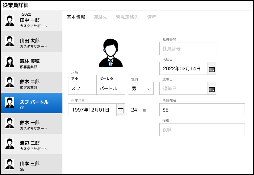 最後にホーム画面に戻り、再び「従業員」をクリックして、「従業員詳細」画面で追加されたことが確認できます。