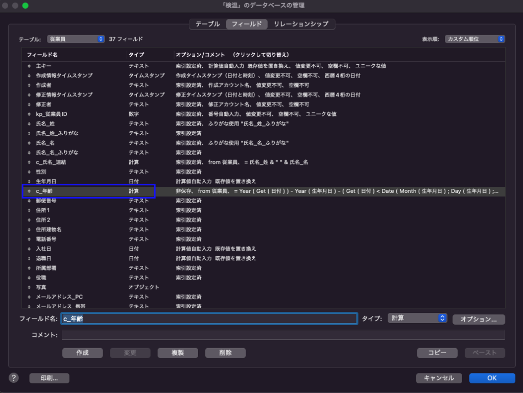 ⑧今回の「c_年齢」というフィールドは計算式タイプのフィールドで現在の日付から誕生日を引いて年齢を計算しています。このように計算して表示するため、インポートする必要がありません。なので、自動的に「インポートしない」となっています。
