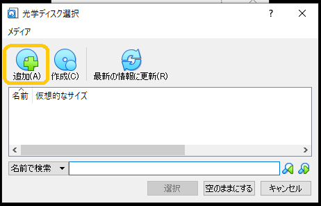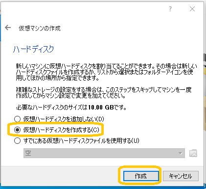 ⑤「仮想ハードディスクを作成する」を選択し「作成」ボタンを押します。