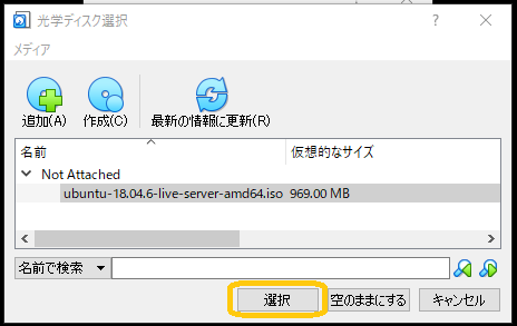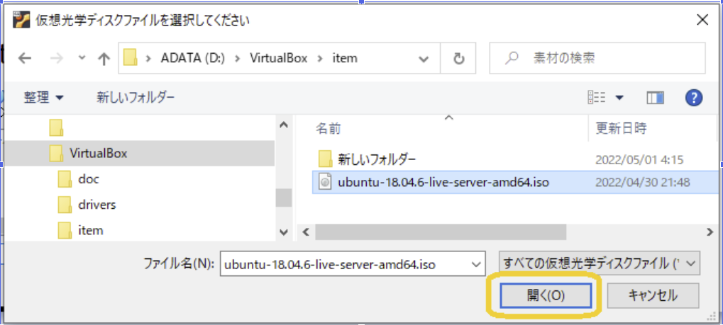 ④「4. Ubuntuのダウンロード」でダウンロードしたファイルを選択して「開く」ボタンをクリックします。