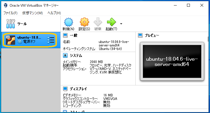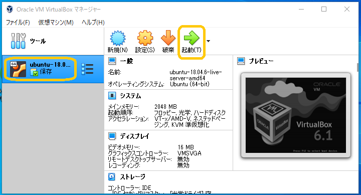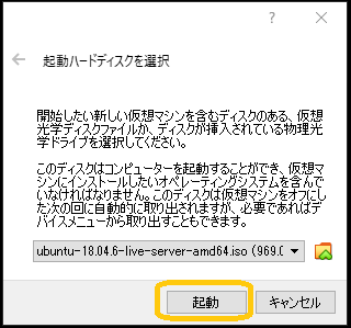①「VM VirtualBoxマネージャー」を起動し「起動」ボタンをクリックします。