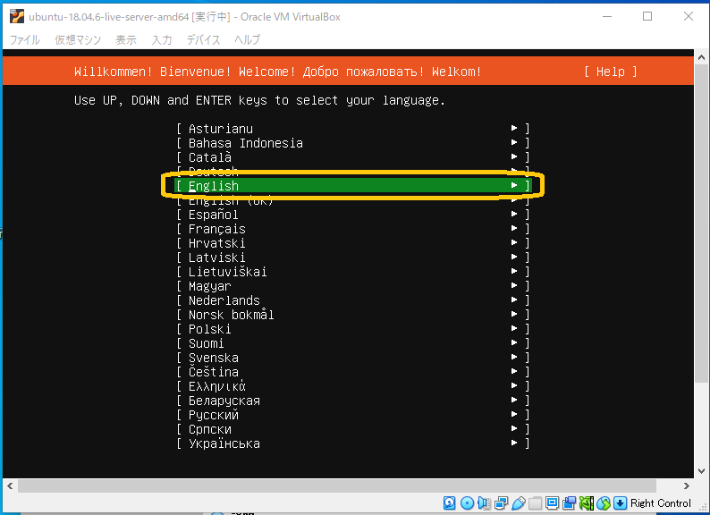 ⑦この画面が表示されますので、言語の選択は「English」を選択して「Enter」キーを押します