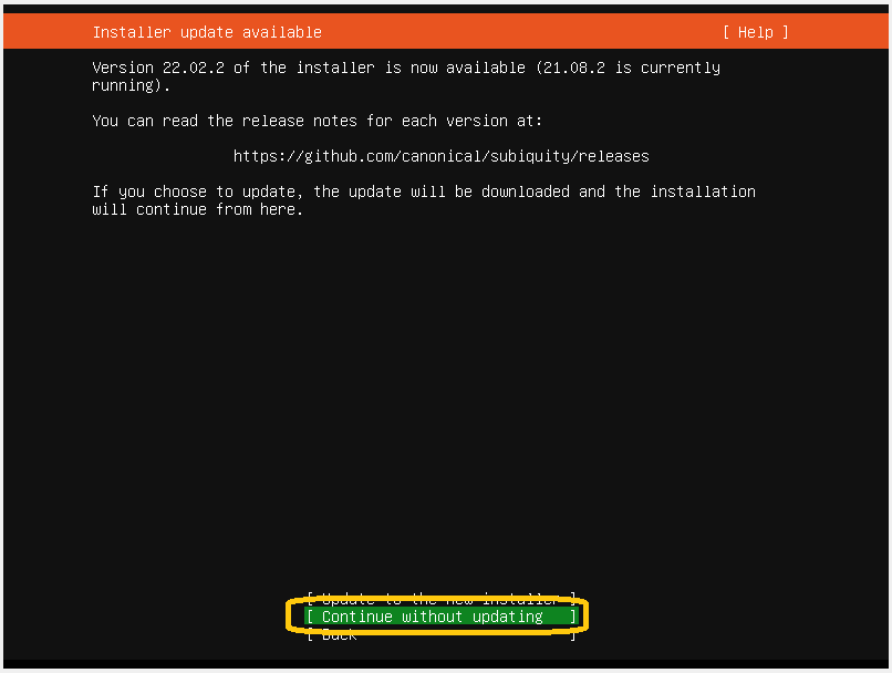 ⑧新しいインストーラーは使用しないので「Continue without updating」を選択して「Enter」キーを押します。