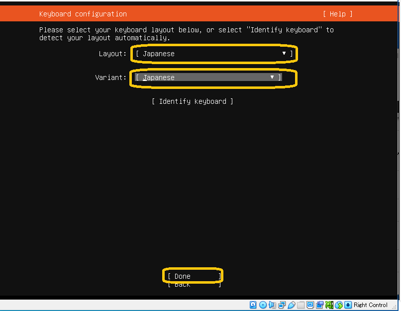 ⑨キーボードレイアウトの選択では「Japanese」を選択します。(ここはEnterキーを押す事により選択できるようになります。)