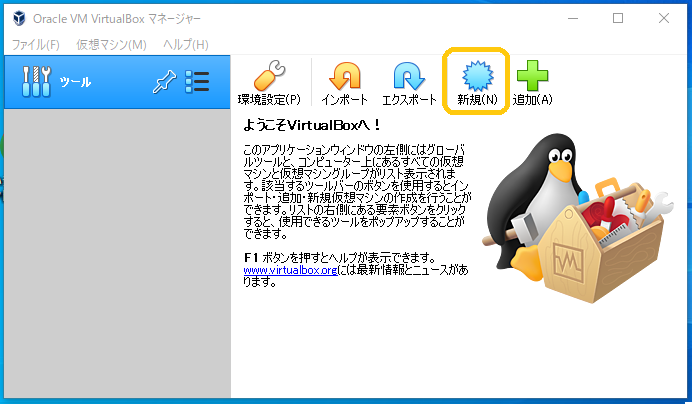 ②「VM VirtualBoxマネージャー」が表示されるので「新規」ボタンをクリックします。