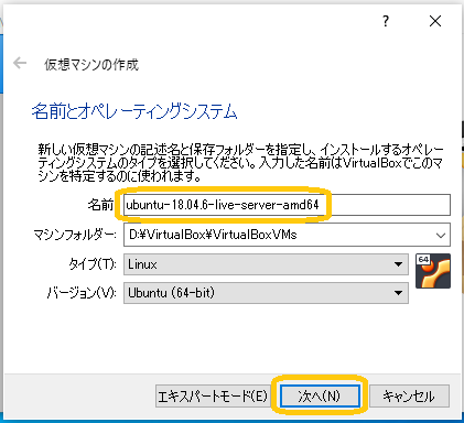 ③名前に「ubuntu-18.04.6-live-server-amd64」を入力し、マシンフォルダーに任意のフォルダを指定、タイプは「Linux」、「バージョン」は「Ubuntu(64-bit)」を選択し「次へ」ボタンをクリックします。