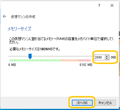 ④「メモリーサイズ」を指定します。「2048MB」に設定し「次へ」ボタンを押します。