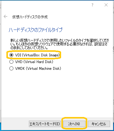 ⑥「VDI(VirtualBox Disk Image」を選択し「次へ」ボタンを押します。