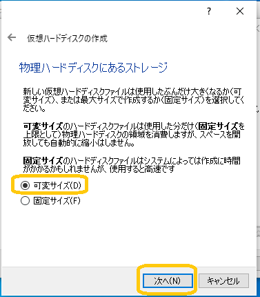 ⑦「可変サイズ」を選択し「次へ」ボタンを押します。