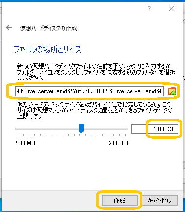 ⑧ファイルの場所とサイズはデフォルトのままで「作成」ボタンを押します。