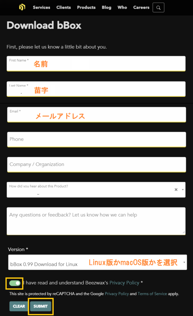 ③「I have read and understand Beezwax’s Privacy Policy」をONにして、「SUBMIT」ボタンを押すと、プラグインがダウンロードされます。